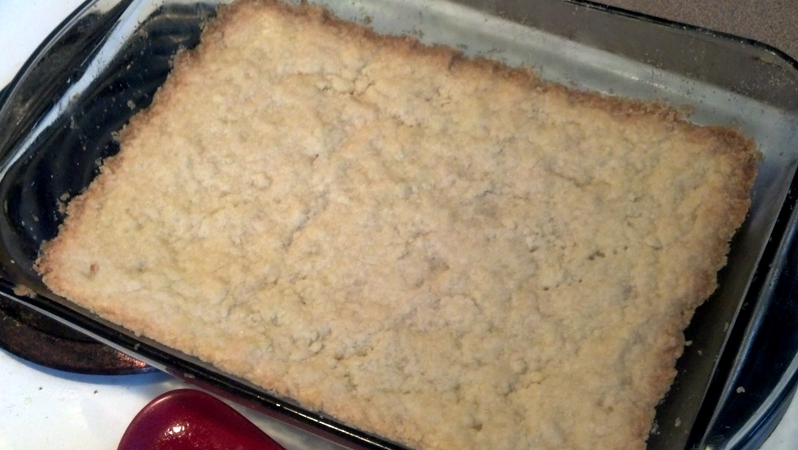 First, make the shortbread. Wash your hands, because you’re gonna get up close and personal with these guys. Put the 2 sticks of softened butter, the flour, and the sugar into a bowl and then mush it all together with your fingers until it looks like a coarse sand. Then, spray down a pan and press the crumbles down so that they mush into a dough. Bake these for 20 minutes at 350 F (or until the edges start to look golden!)