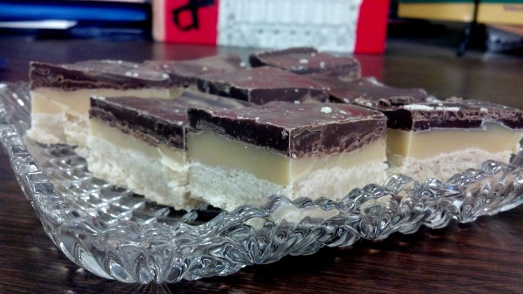 When your chocolate is melted and spread over your gooey caramelly, shortbready goodness, sprinkle a little sea salt on top before sticking the whole lot into the fridge until the chocolate has set. Slice into bars (or little candy bite-sizes if you want a fabulous finger food!) and serve with enthusiasm. Your audience will LOVE them. Or you can just hoard them.