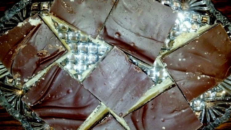 When this ambrosia is finally to your desired consistency, spread it over your (relatively)chilled shortbread to set a bit. It will still look gooey when you pour the chocolate on, so don’t stress! Get ready to melt down your chocolate with your favorite chocolate-melting process. I know double boilers are highly recommended, but seeing as I don’t have a real one (substitutes aren’t my favorite since I always end up grabbing the scalding-hot bowl when using the improvised version), and impatience is my vice, I usually go for the microwave-40-seconds-at-a-time-stir-repeat-til-melty method. Highly effective.