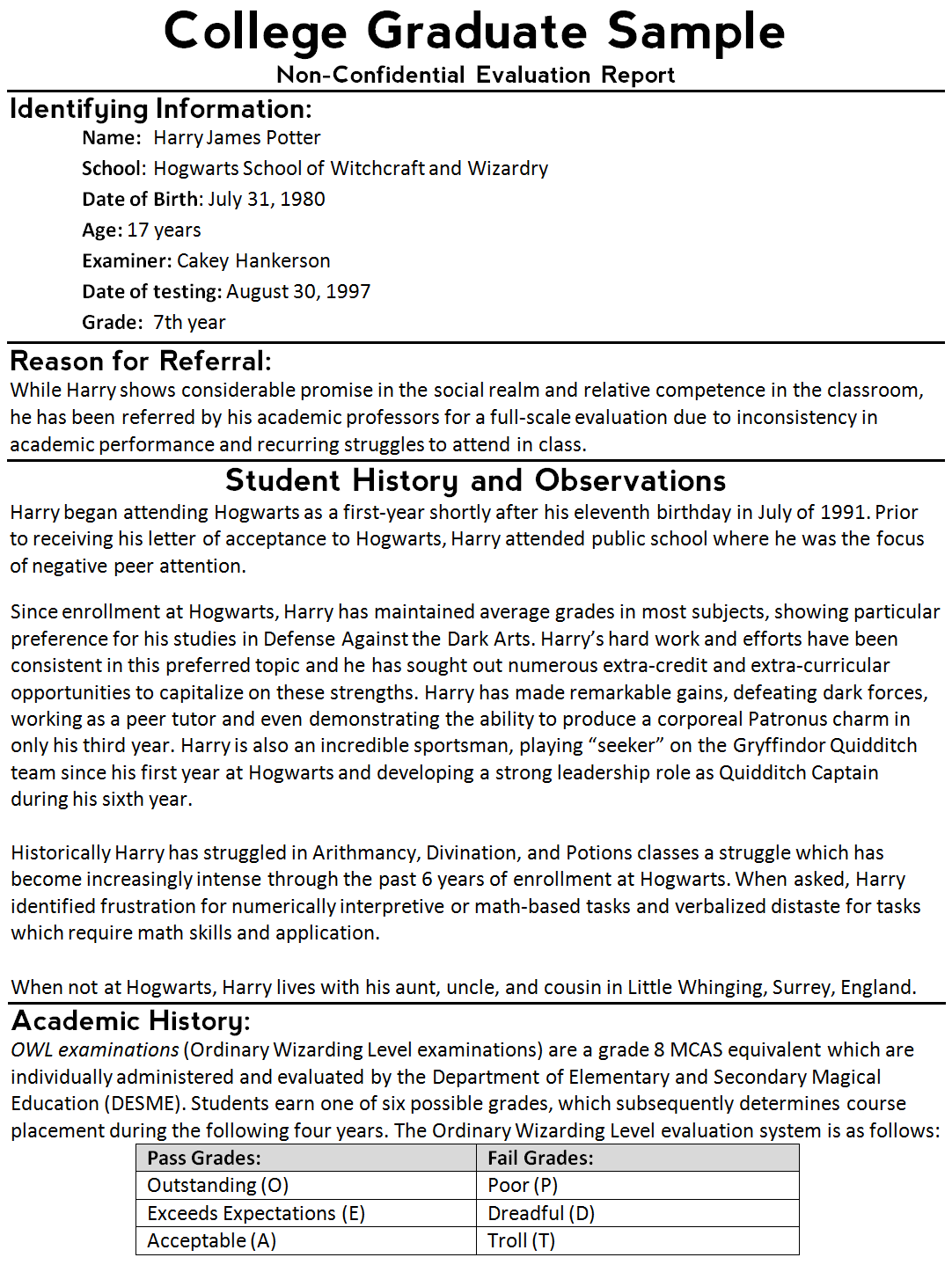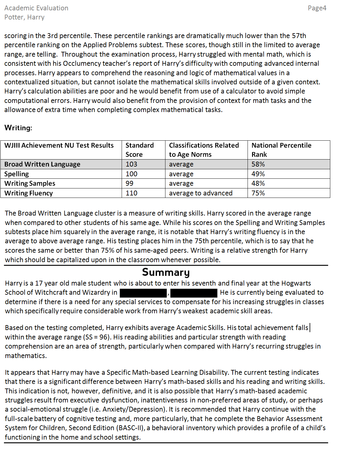 That said, in one of my more toffee-ish graduate classes, we had to learn how to write a full-scale testing report. If you’ve never had the opportunity, it’s distinctly dull (Is that an oxymoron?). SO, in an effort to transfigure a miserably boring assignment into a more palatable process, I decided to put a magical spin on academic testing. I am pretty proud of the result, and will go so far as to claim that what you will read below is almost legitimate enough to be sent to the Special Ed department at Hogwarts School of Witchcraft and Wizardry!