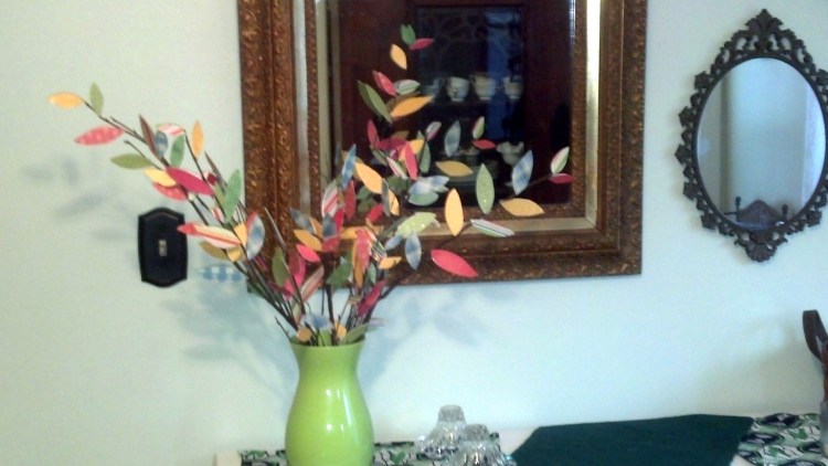 I love fresh flowers and these are a nice low-cost substitute! All you need is bare branches/sticks and scrapbook paper!