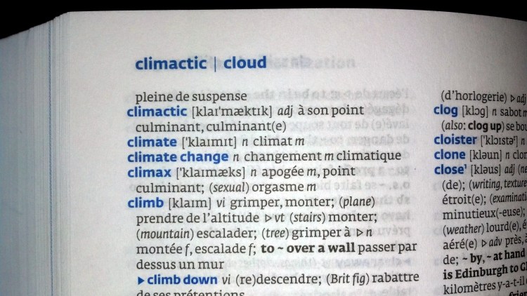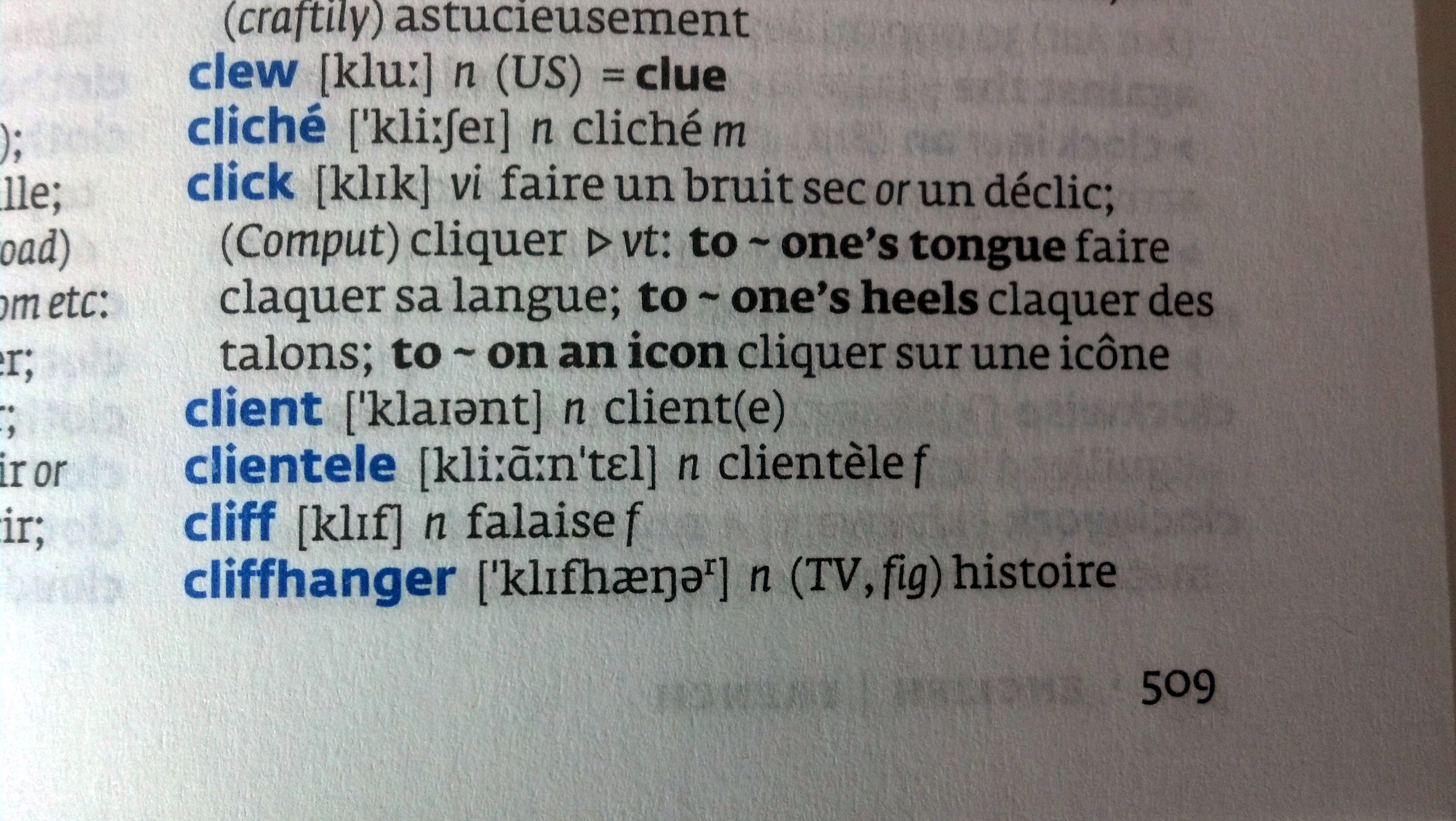 One day, during a French class I was teaching, I was curious to know how one might say the word/expression “a cliffhanger” en français . Since I didn’t know, I decided to model good language-learner behavior by looking it up in my handy-dandy French-English Dictionary. But when I looked at the definitions, this is what I saw: