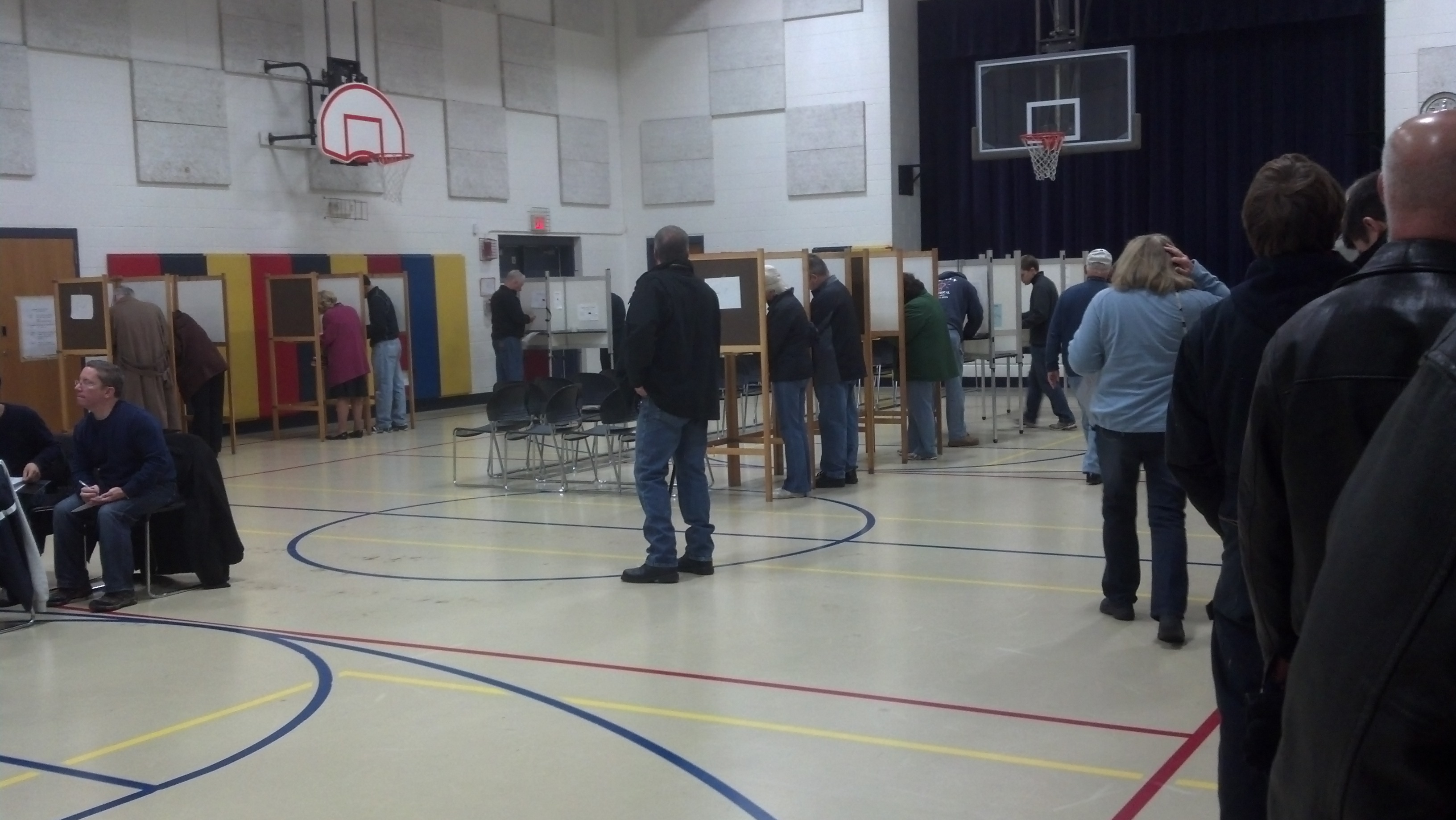Stressed out commuters shifted from left foot to right faster than a three year old in line for the potty, but none of that nervous energy came out in noisiness; the entire elementary school was eerily silent. One of the poll workers walked by the line and muttered “Geez, it’s so quiet. ‘ts like a funeral out here.”