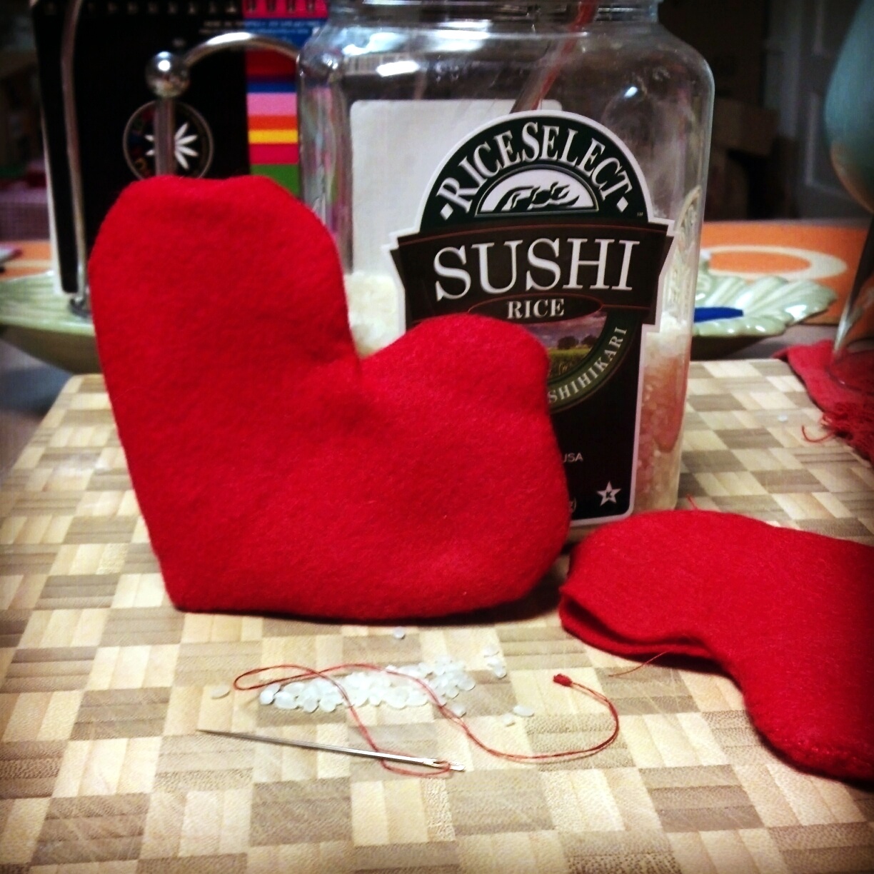 Leaving no small amount of rice scattered around my kitchen, I managed to fill the little sachets, then sewed the final opening closed carefully, so that it did not look highly different from the rest. I also used the thread to make a double-seam, sewing carefully around the entire heart a second time. That fnished, voila!