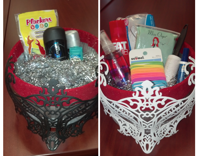 We always try to keep some necessities available in the bathroom, for those just-in-case moments when students wish they had planned ahead! I happened to have a couple of baskets around, and so I decided to jazz ’em up for the masquerade theme.