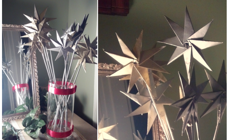 Trying to Embellish the Vases...Not perfect, but an improvement nonetheless. Fill these up with roses and baby’s breath and you are good to go! Well, baby’s breath and another little starry detail . . . I made up some gold and silver mini-stars in the same style as the big stars (only with about 2 inch square paper to start with). When they were done I hot-glued them to some slim little dowels to make the bouquet accents.