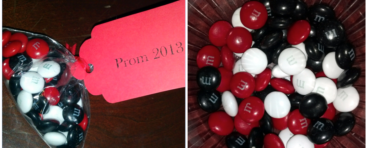 With a dozen cheap cylindrical dollar store vases on my hands (a combination of those from dances past and a few present-day purchased to match), I thought we might be relegated to less-than-perfection as far as centerpieces go. . . until I remembered a random spool of red ribbon I had picked up after Christmas in some sale bin.