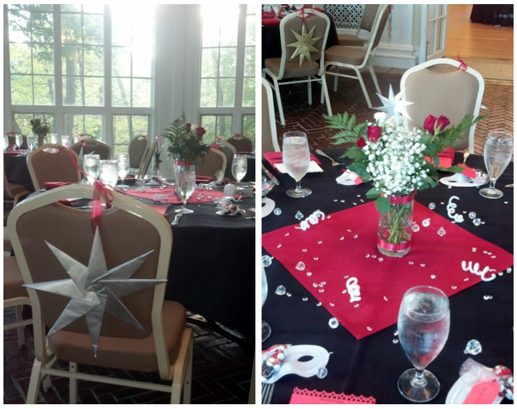 So, as is the now-annual tradition, I have the privilege of planning/coordinating the aesthetic details, in all their (hopefully creative) glory! After last year’s fishy-centerpieces and Enchantment under the Sea theme, I was pretty excited at the potential for timeless elegance as a decorative choice this year! The ladies of the student council set the colors as black, white, and red, with accents of gold and silver. With those in mind, we tackled the details, and This year, we have quite the rundown as far as decor is concerned!