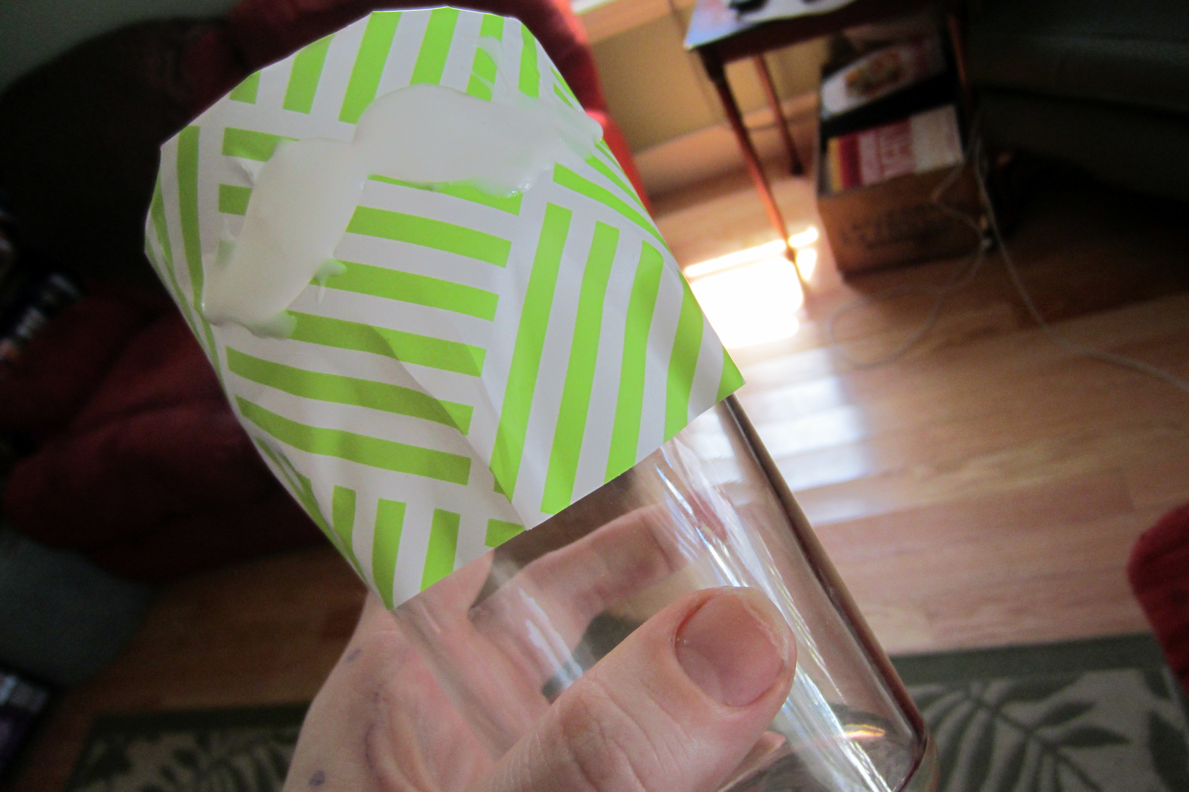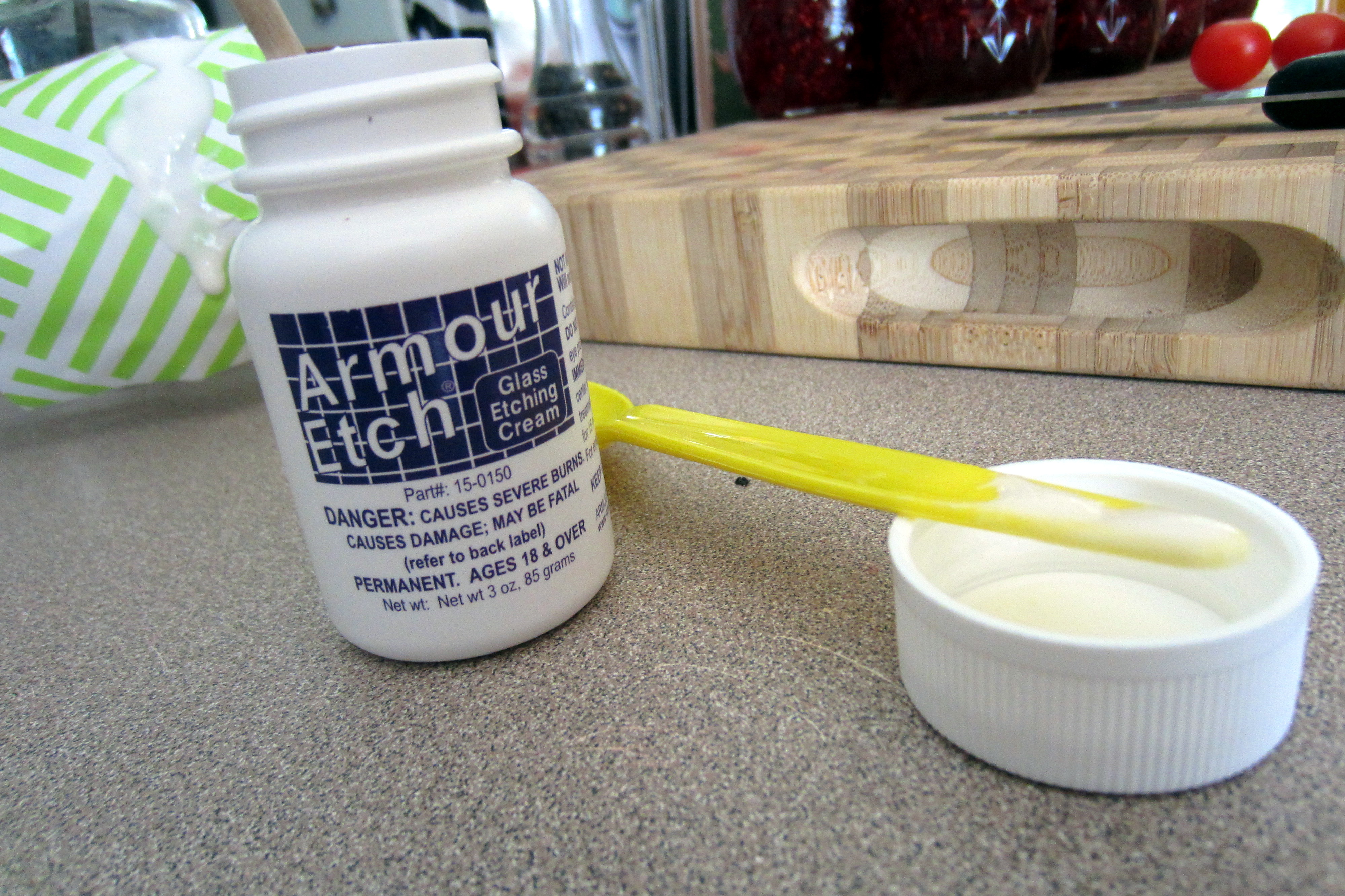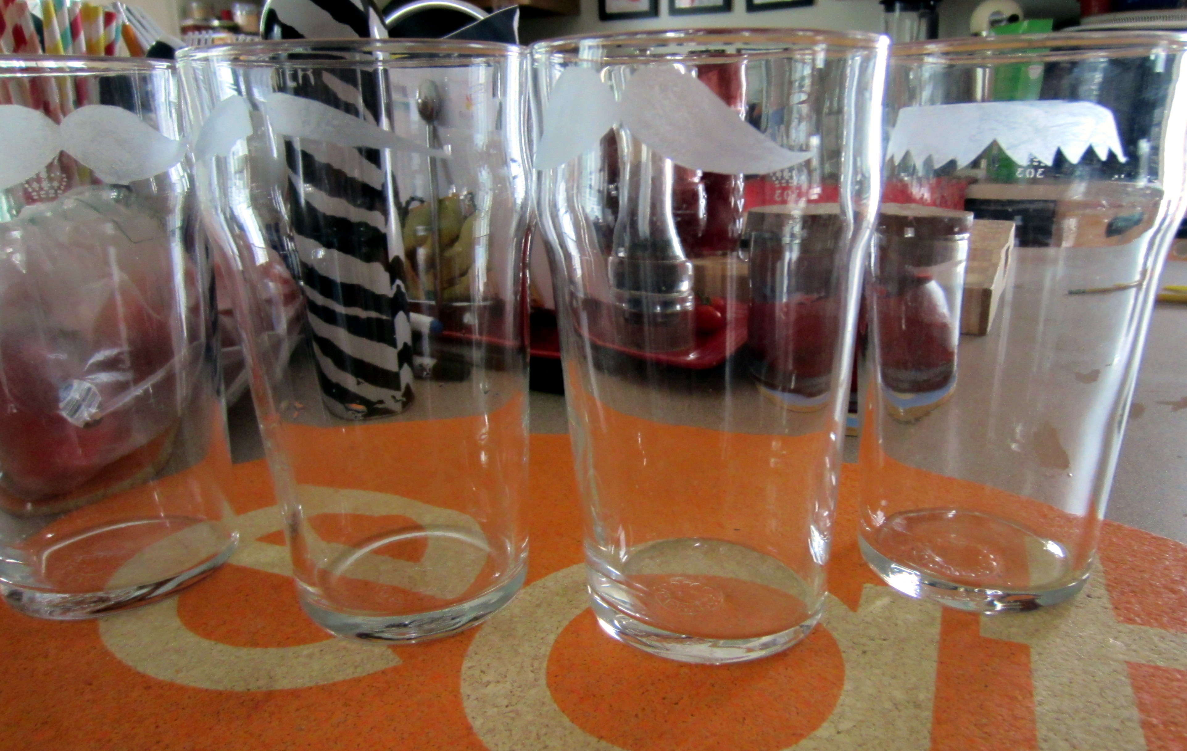 Once the glasses each had a mustache-shape, all I had to do was apply Armour Etch (which I bought on Amazon, because it was cheaper than the craft store!) to the visible space!
