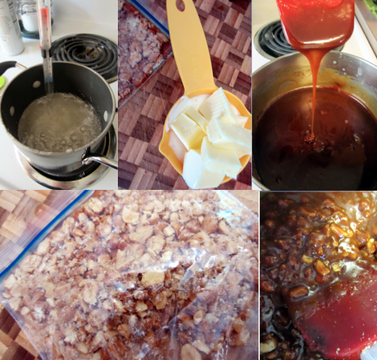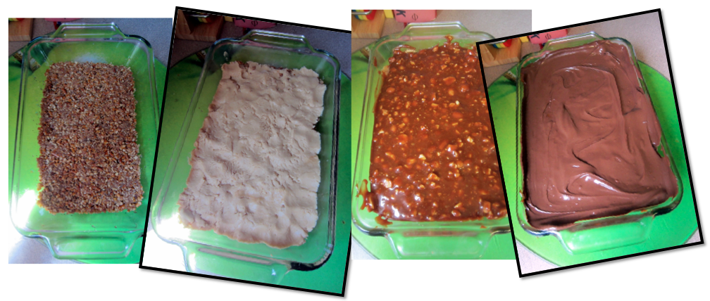 THEN, when the caramel is cool(ish) crush up about 1 cup of honey roasted peanuts and put those bits into the caramel before spreading those on top of the peanut-butter-fluffy-stuff layer.