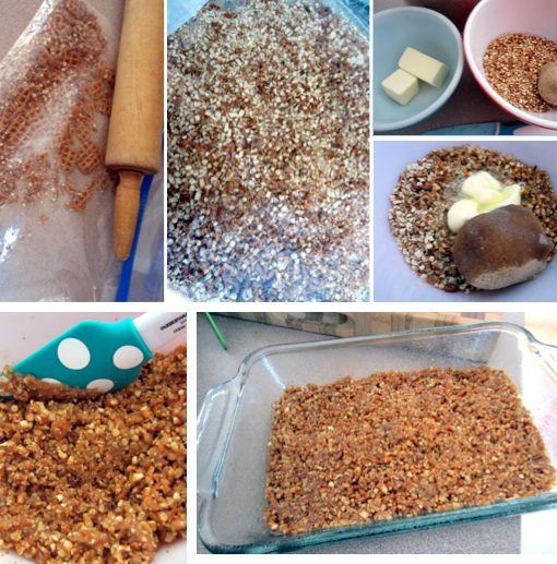 Crush up pretzels so that you have 2 cups. Then mix the crushed bits with 3/4 c. melted butter and 1/2 cup light brown sugar. Bake this at 350 for about 10 minutes.