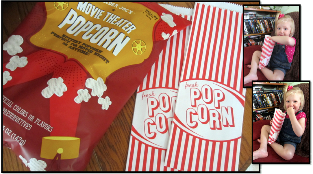 I highly recommend making your own mini movie-theater event, especially if you have a popcorn-obsessed 3 year old in your life – it’s a fun rainy-day activity!!!