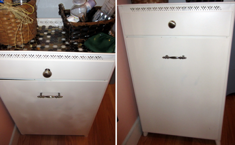 I bought an old hamper, because I thought it might fit in just the right spot in my apartment – which it does! It’s made of metal, and I think the design is cute . . . plus, for $5? Where can you go wrong, am I right?