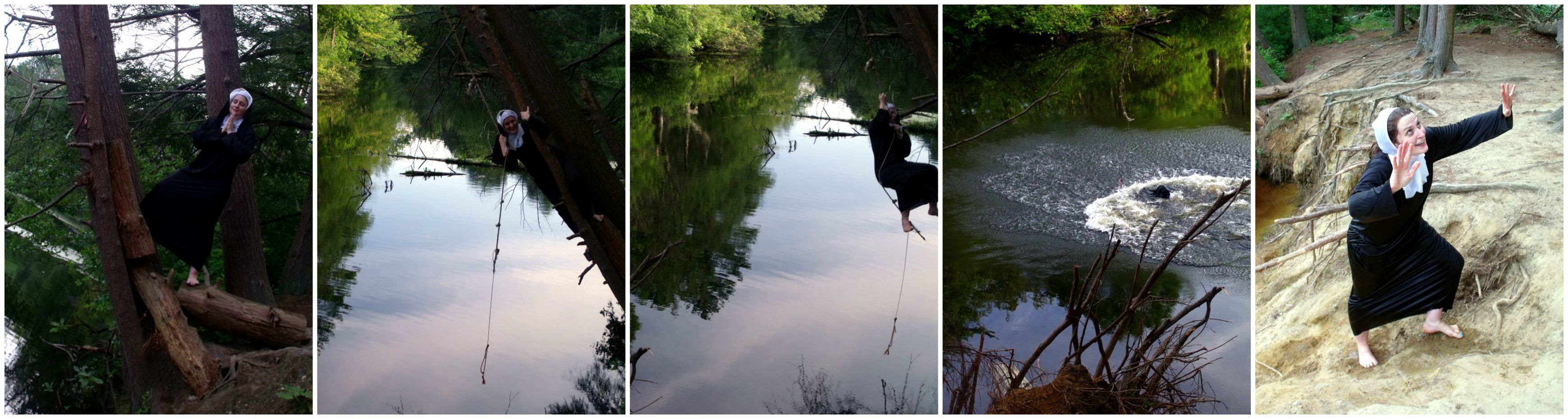22.)A fully dressed nun in her habit going down a waterslide or swinging on a rope into a river.