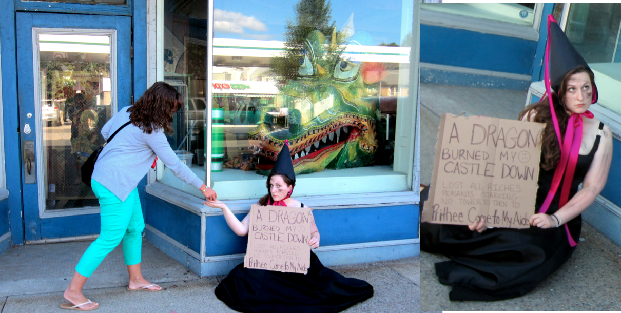 10.) While showing some sign of the dragon-attack on your clothing or body, panhandle on a sidewalk (NOT ON A MEDIAN IN TRAFFIC!) with a sign that reads: “A DRAGON BURNED MY CASTLE DOWN.”