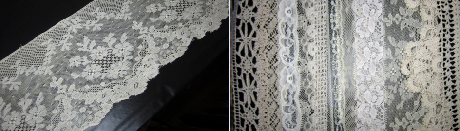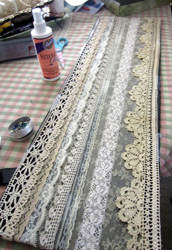 As I laid the lace out, I realized how truly lovely this might wind up looking! I overlaid the different pieces of lace, using the occasional piece of tape to attach it firmly in place.