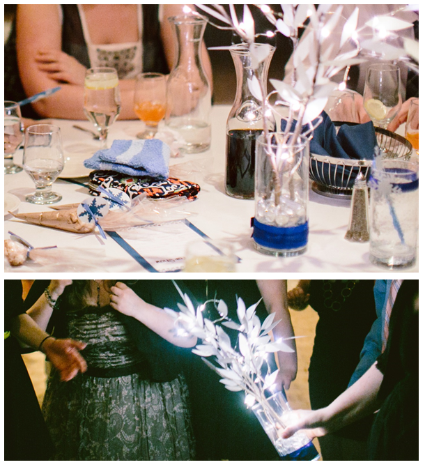 To these leafy, twinkly, not-quite-floral arrangements, we added a cut-crystal dish of navy-blue, white, and silver m&ms as well as a small glass to hold those lovely, snow-flakey pens pictured above. What might theeeeey be for, you ask? Well, I’m so glad you brought it up, because that brings us to our next element of themed fun . . .
