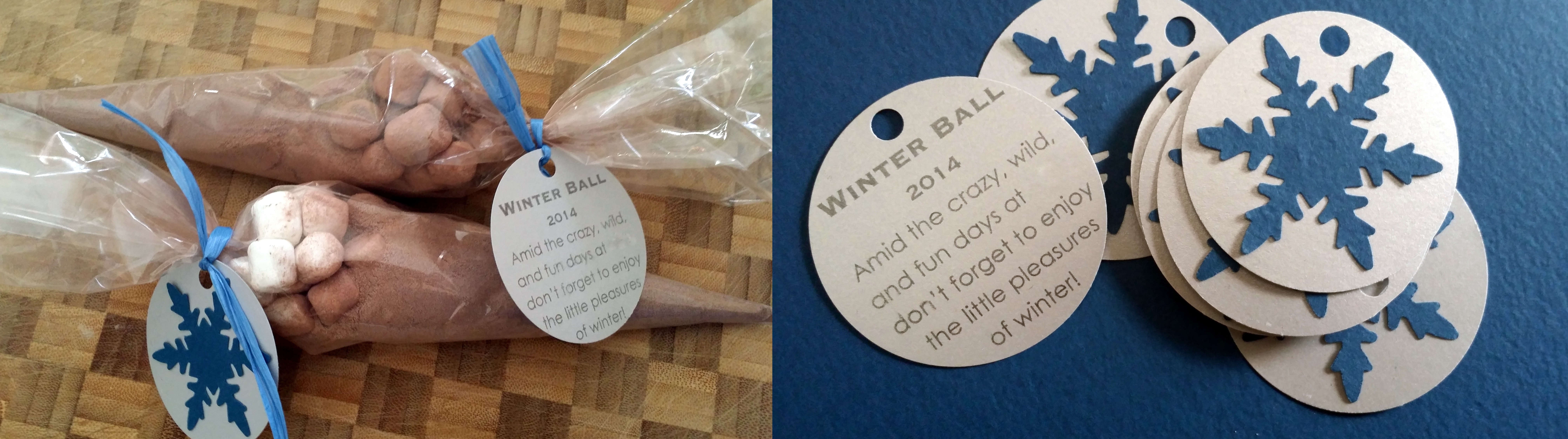 What better to give as a favor for a Winter Ball than Hot Cocoa? Inspired by some adorable winter wedding favors on pinterest, we decided that it would be a fun direction to go, and we were not mistaken. We designed our own label, used some of the same cardstock we used for the leaf-creation, and put them together one chilly Wednesday afternoon. They turned out adorable!