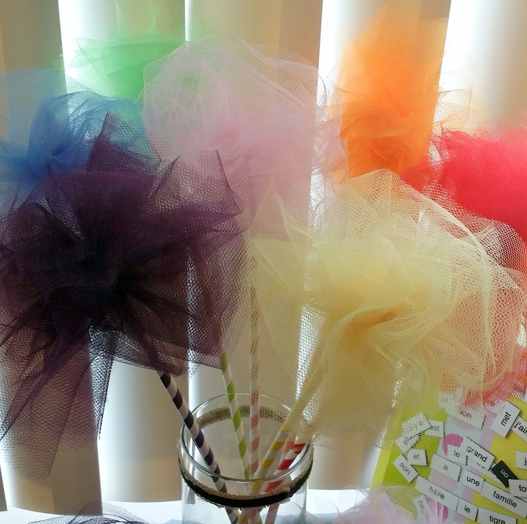 - spools of multi-colored 6″ wide tulle rubbon (in your desired colors ~ I got mine on Etsy through the following shops: BerrySweetDetails,tatsy, Morrell Decor, SwankNotion, and Halfmoonquilts)