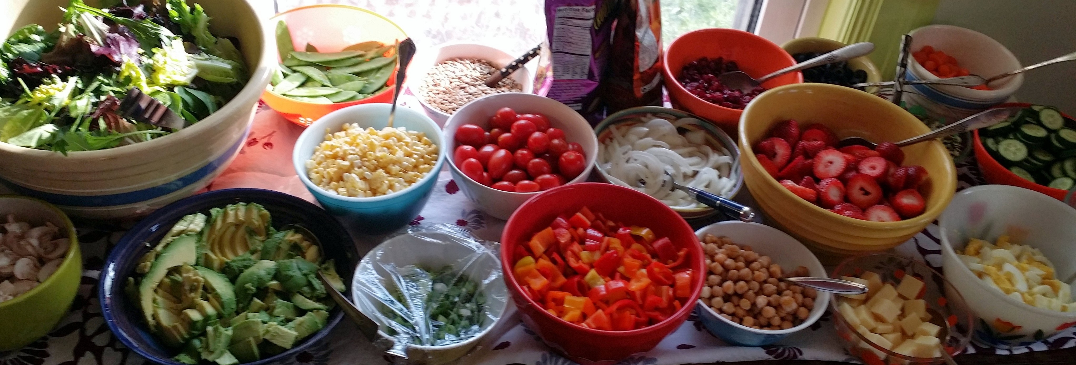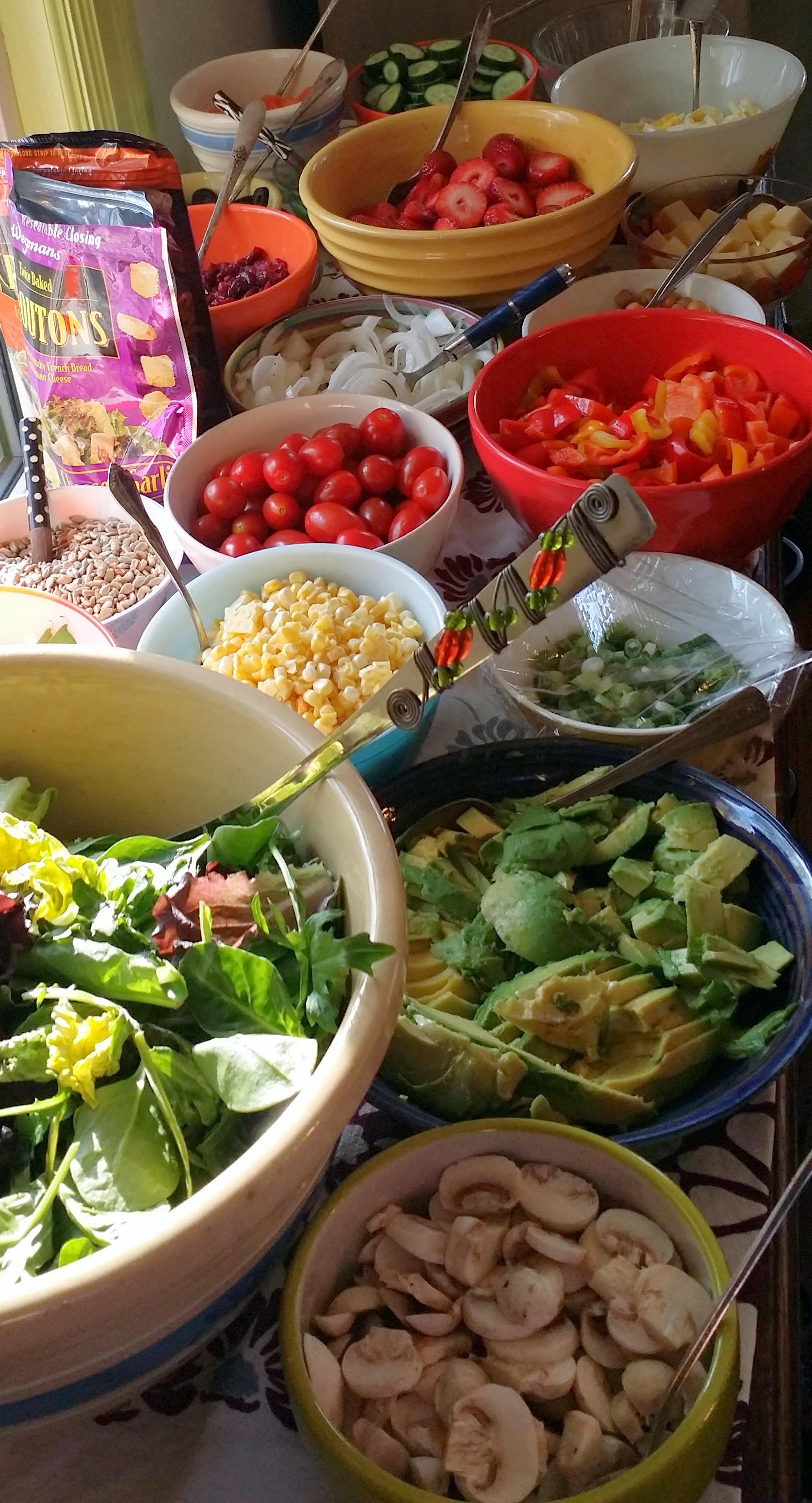 Salad is only boring if you lack imagination, friends. The spread above is the delightful smorgasbord of salad accoutrements that I recently enjoyed with friends.