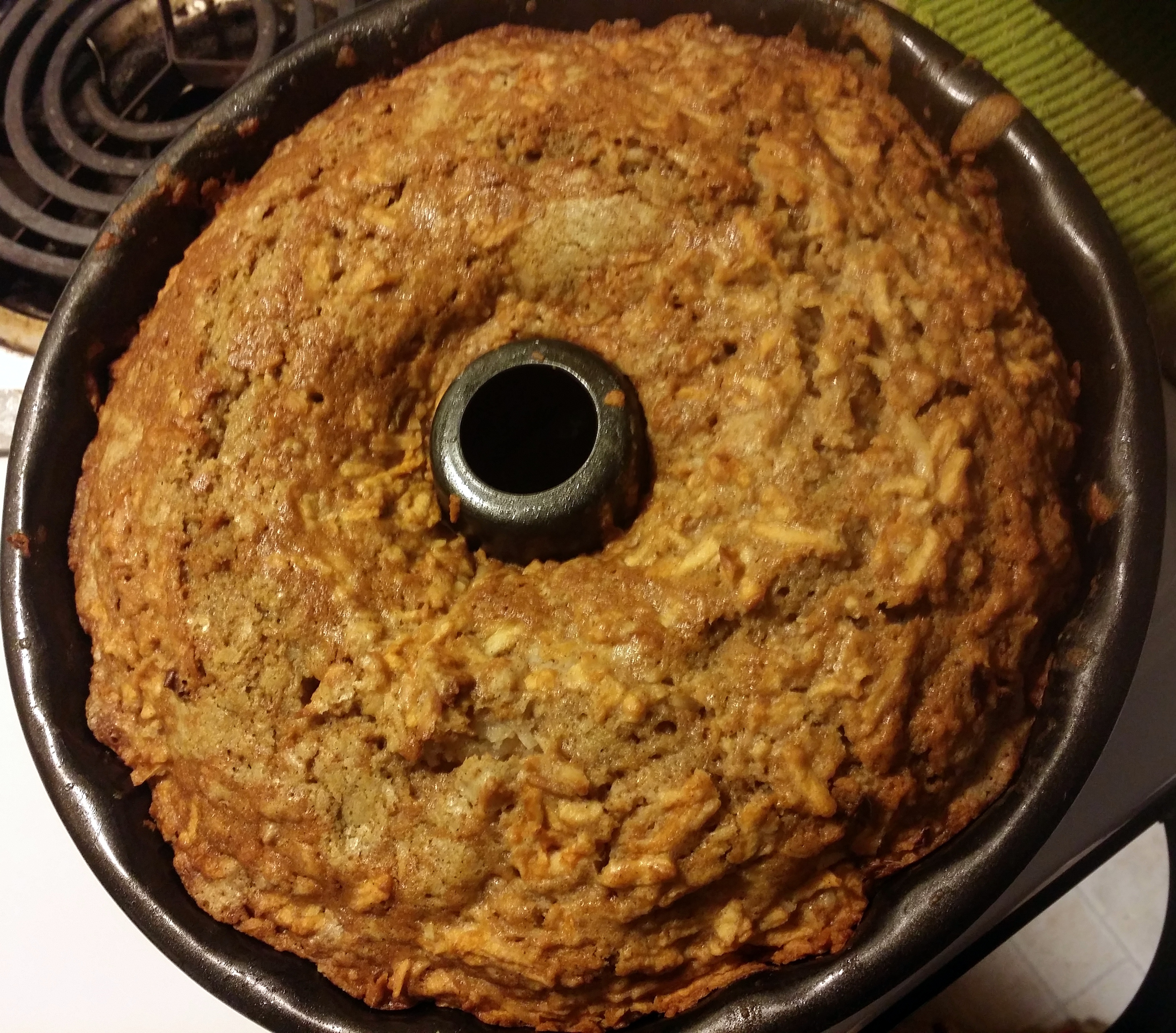 - Stir together sugar, eggs, coconut oil, coconut milk, flour, baking soda, salt, cinnamon and vanilla in a large bowl. Fold in apples and coconut, and then pour the batter into a buttered Bundt pan – the batter was quite thick!
