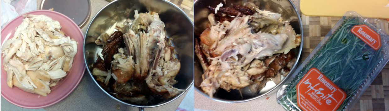 Once you’ve picked it clean, put the carcass, the fresh rosemary, and at least one container of chicken stock in a pot and boil it. This makes an amazing, aromatic, and delicious broth-base that will amp up the awesome-factor of your soup!