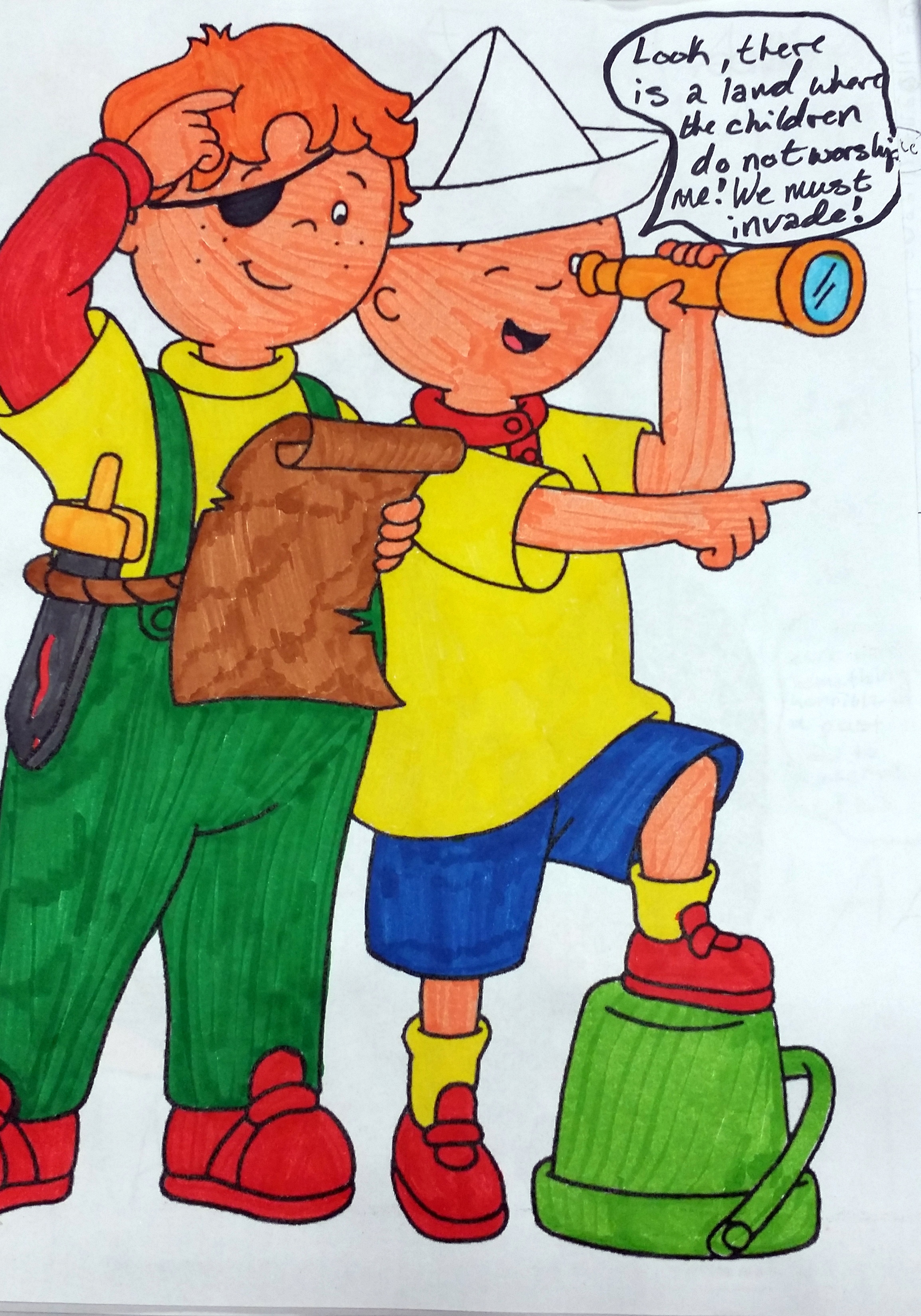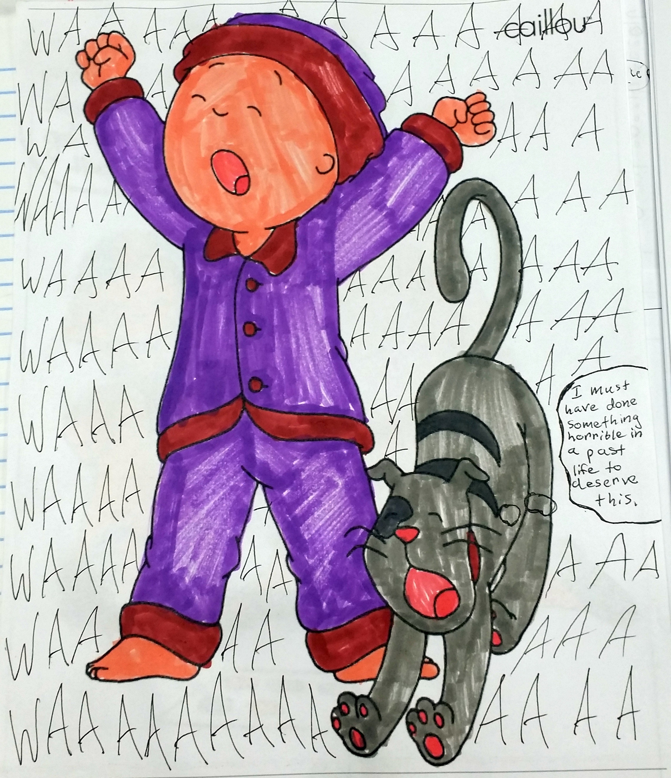 Thought: High School Students that I teach also have strong & unified Anti-Caillou feelings. After finishing their work, my students will sometimes print out a coloring page so that they can just relax and de-stress for a little bit . . . these are some of the Caillou-themed pages they gave me one year: