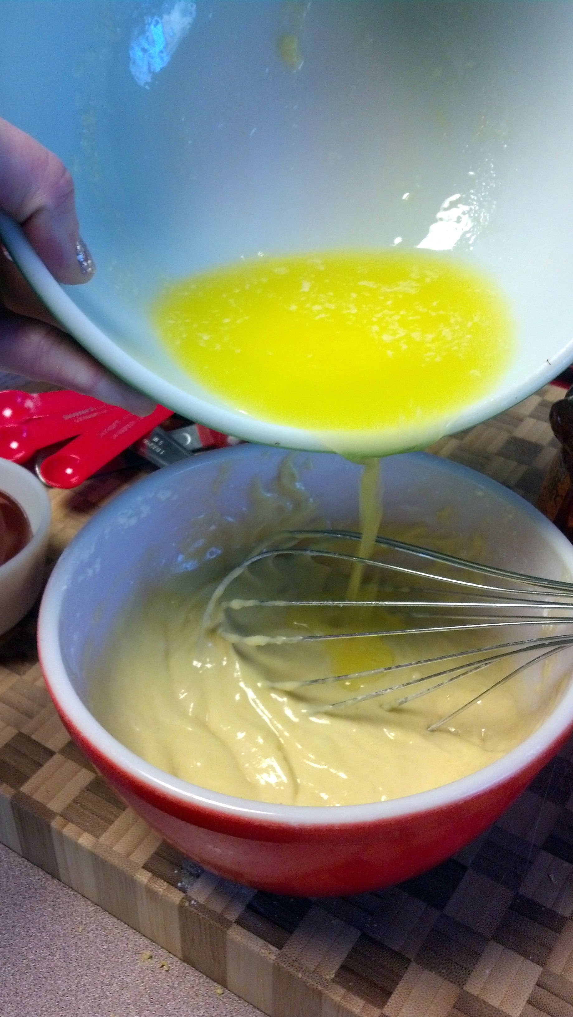 At this point, your butter should still be liquid, but somewhat cooler than before, so this is its’ big moment . . . stir it into the rest of the mixture, followed by the lemon juice.