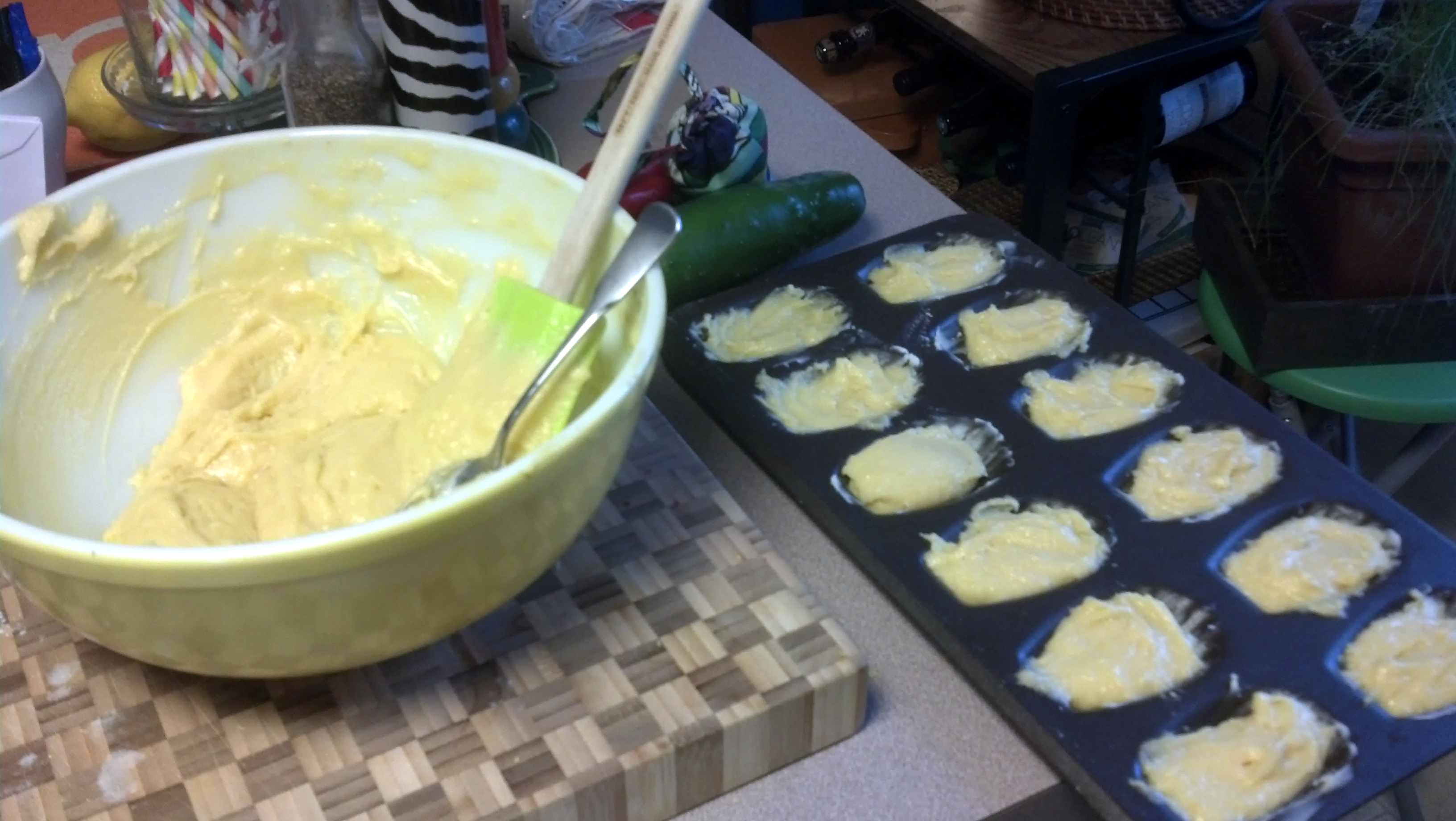 First you melt the butter and set it aside so it’s not scalding hott. Then, while you’re on the subject of butter, grease up that madeleine pan generously. After you set that buttery cake mold aside, break the eggs into a bowl and add the vanilla extract.