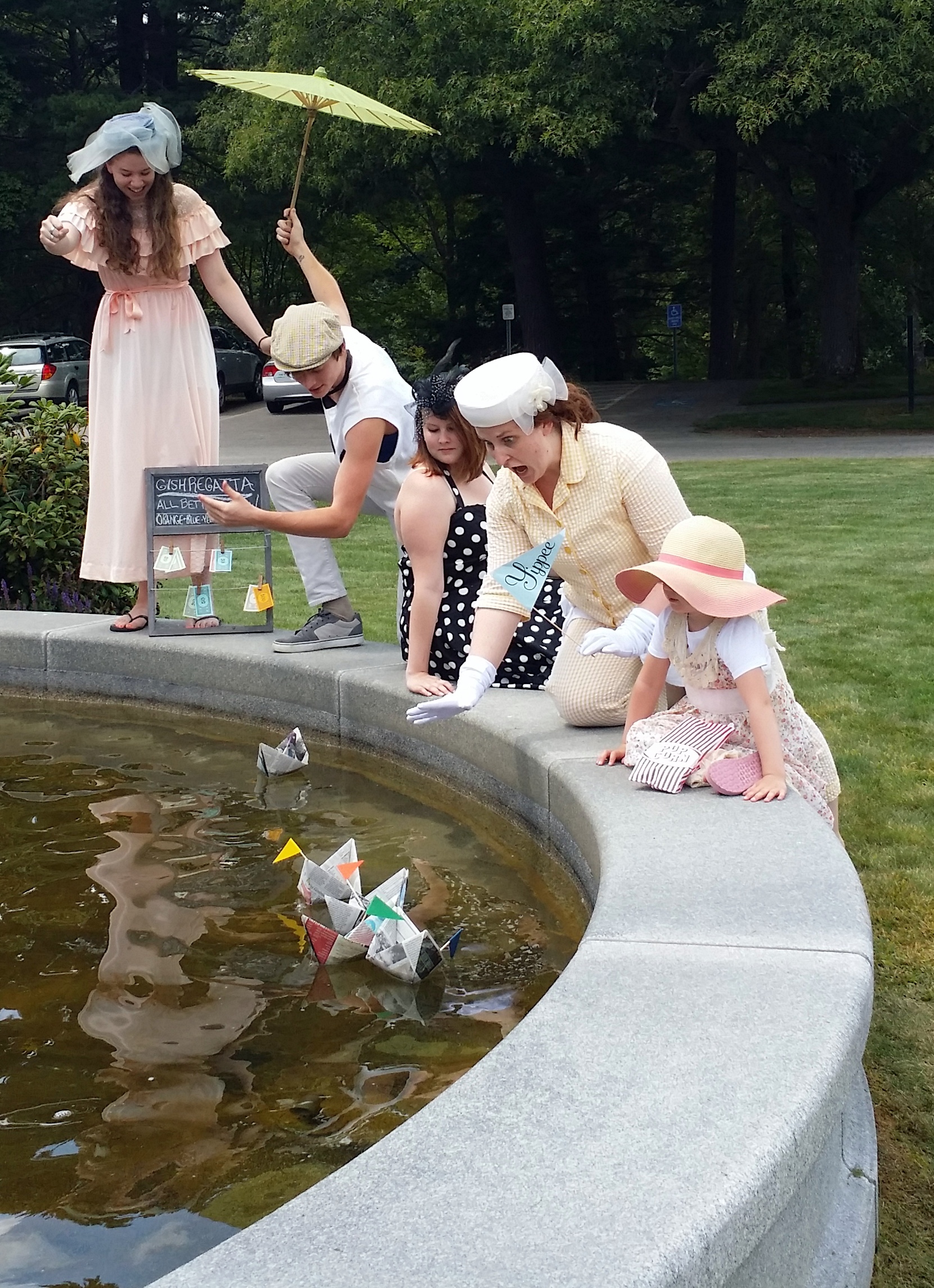 Photo Prompt: Stage a mini-newspaper boat regatta in a public fountain with at least four competing vessels. We must see intense competitiveness and gambling.