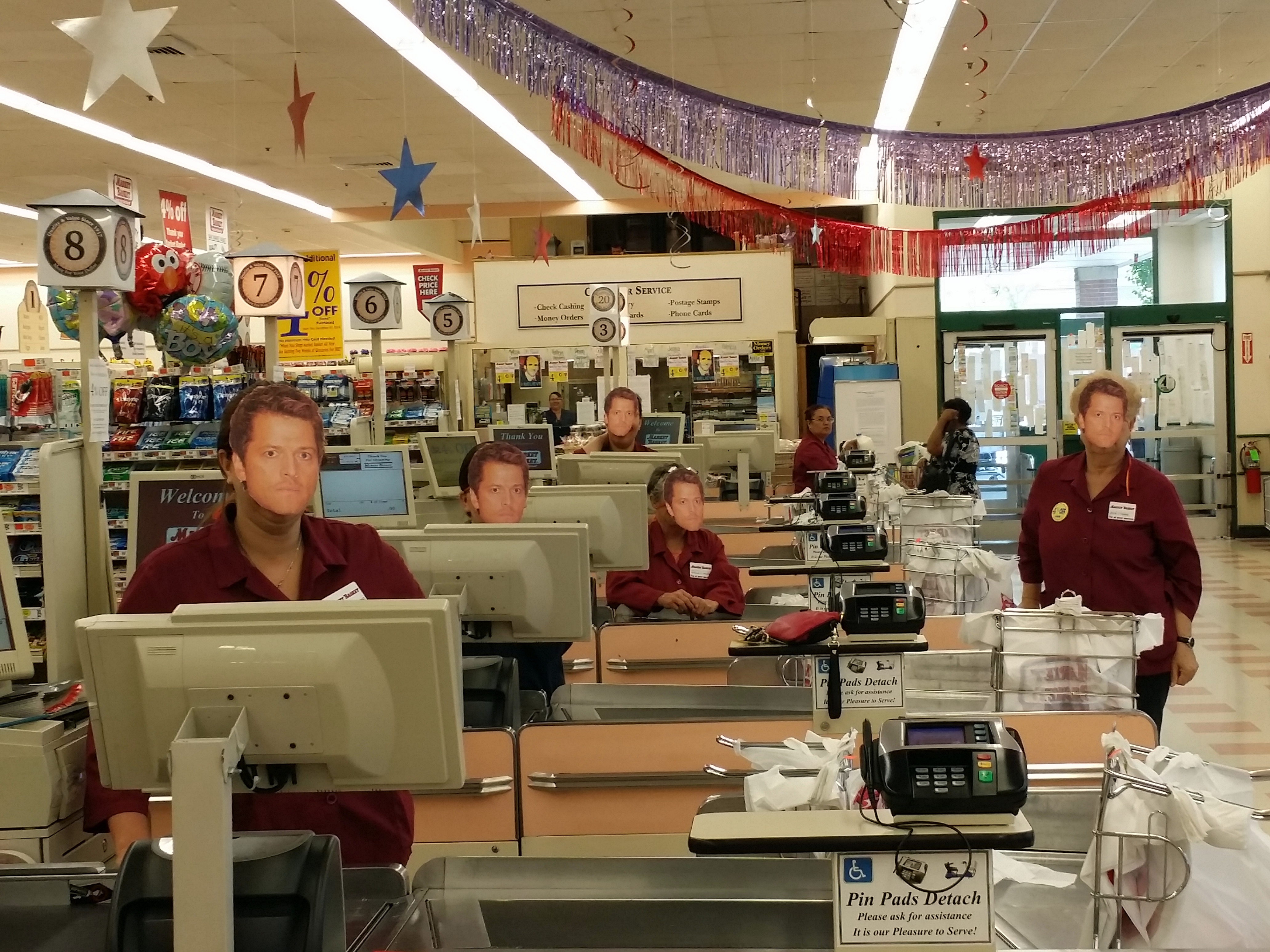 Photo Prompt: Get all of the checkout employees at a supermarket to wear “Mishapocalypse” masks as they ring up customers. They all must be working their individual registers when you take the picture. There must be a minimum of four checkout workers. The more cashiers, the more points.