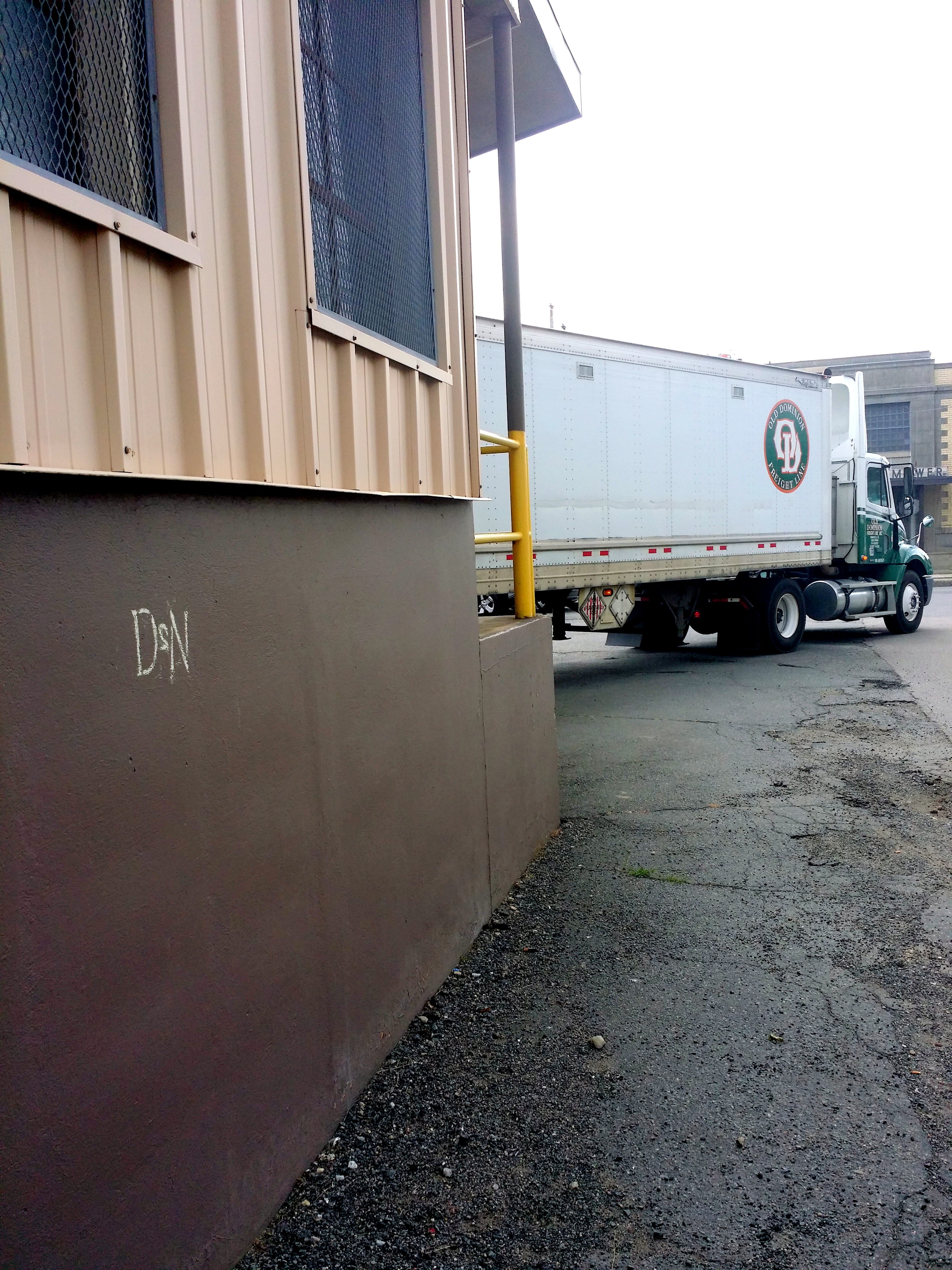 Photo Prompt: Using charcoal or chalk, stencil the term “D2N” on the exterior of a factory. (The “2” must be backwards, but I can’t figure out how to do that on this keyboard.)