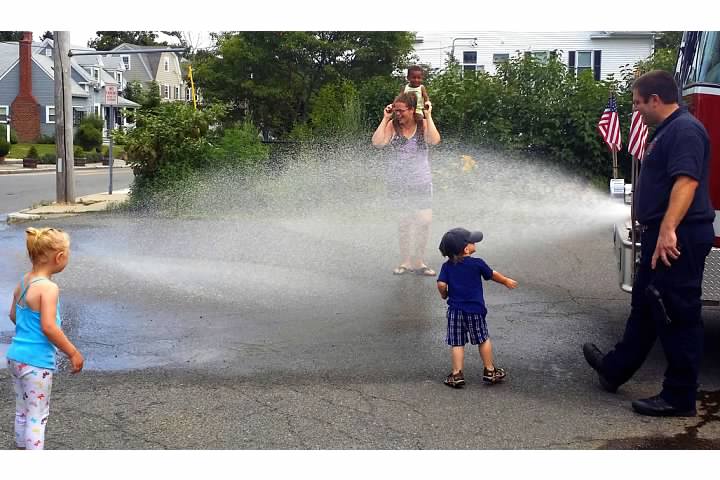 Photo Prompt: It’s August and in much of the world we’re sweating right now. In a region with plentiful water, let’s see gleeful children and firemen playing in an elaborate, temporary water park built by your town’s firemen using fire department equipment.
