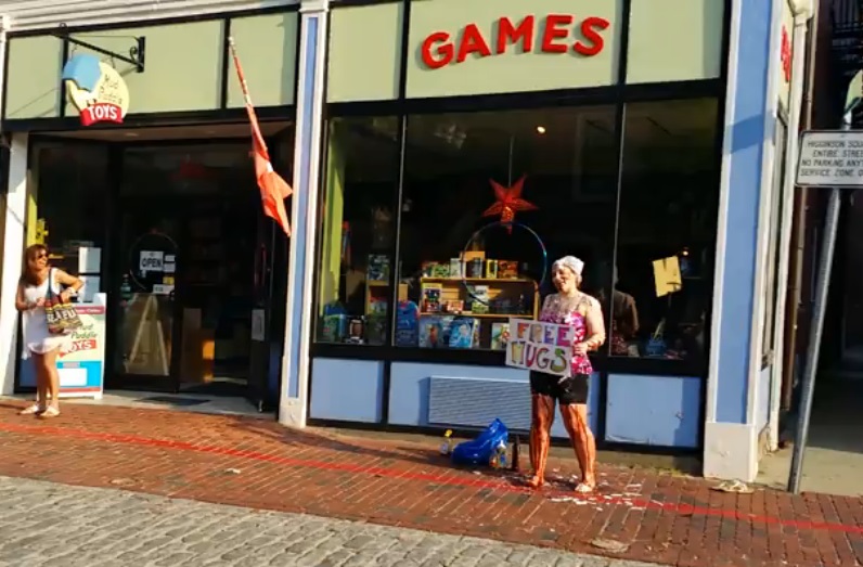 Video Prompt: You see people holding up signs from time to time that say “free hugs.” I have always been wary of those people. I don’t know what it is they’re after. Are they trying to cop a feel? Get me to buy a timeshare? I avoid them. But your “free hugs” sign won’t leave any doubt in the readers’ minds… Wearing a bathing suit, cover every inch of your exposed skin with honey, whipped cream, syrup or jam. Hold a sign on a busy public sidewalk that reads, “Free Hugs.” Enthusiastically attempt to recruit hug-victims.