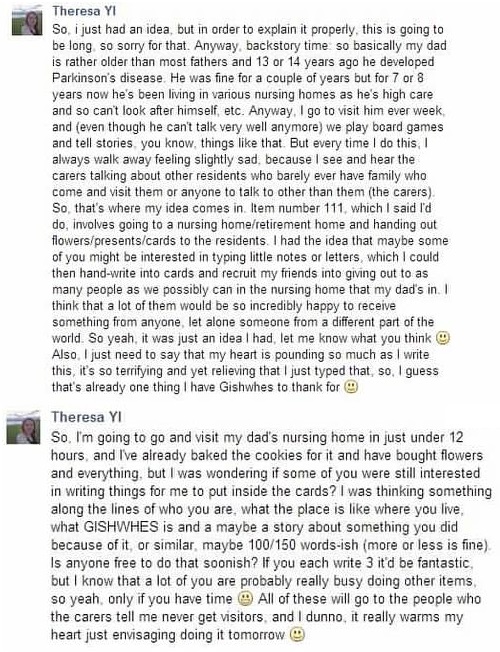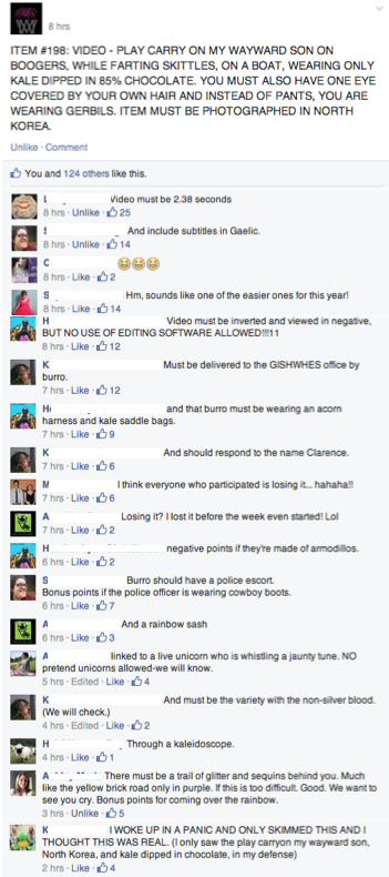 One unifying factor for this delightful conglomeration of gish-folk is that enjoyed the absolute ridiculousness of frenetic GISHWHES activities, and can all understand what it means to exist in scavenger hunt mode. The day after the hunt, the following thread took place, much to my delight!