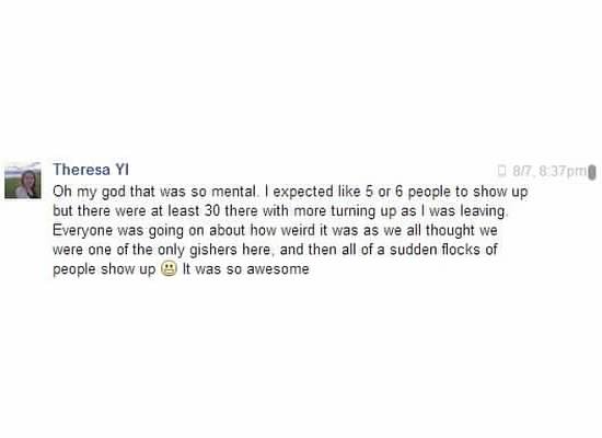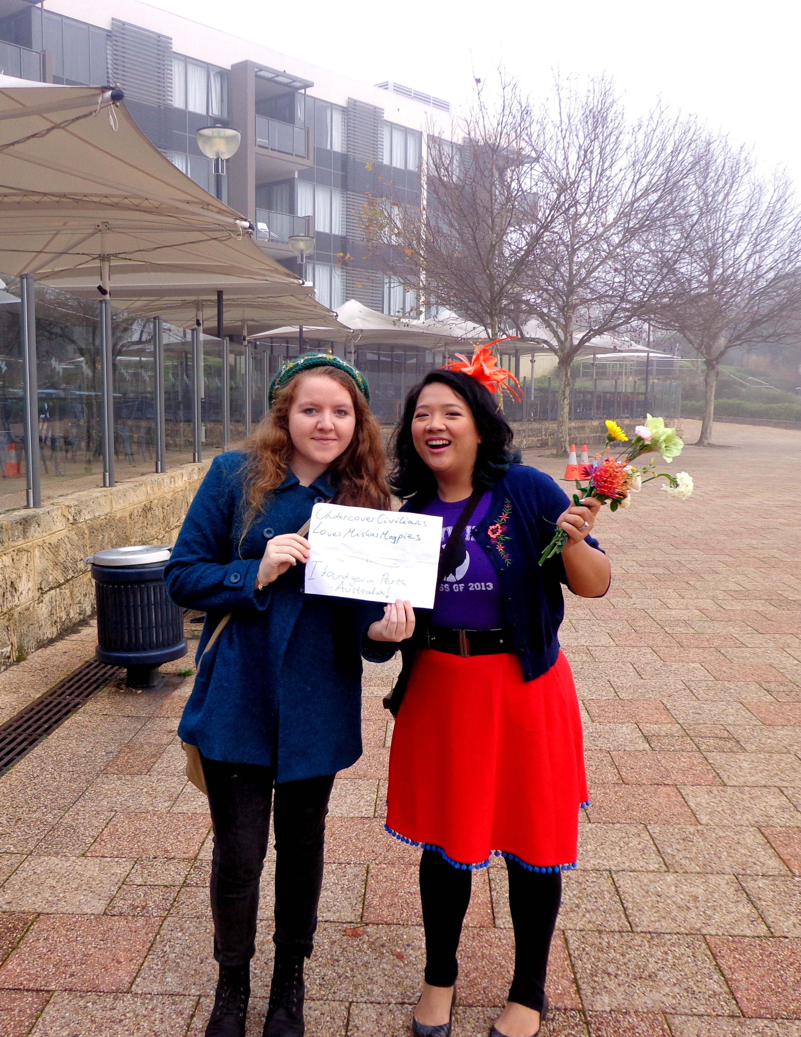Photo Prompt: Find a woman at Toast, East Perth, Australia on Friday morning 8:00-8:30 am (Perth time, of course). She’ll be wearing a red skirt, a purple GISHWHES t-shirt and a navy cardigan. Get a picture of her and you, with you holding up a piece of paper with your team name and “I found you in Perth, Australia!” written on it. Bring her a flower.