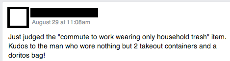 I may have missed my calling, because this was really fun. I wonder if there’s a market outside of GISHWHES for improvising clothing out of household objects. Hmmm.