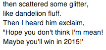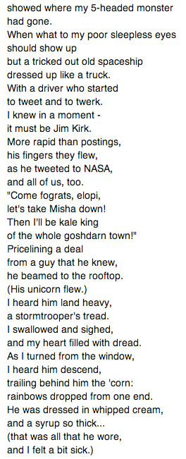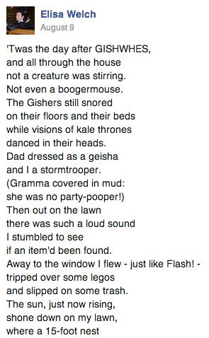 Throughout the hunt, AND after, creative people shared their inventive perspectives on the hunt in ways I would never have dreamt up on my own. One perfect example was a poem that one Gisher, Elise, posted a day after the hunt ended this year. Forgive the fact that I will be sharing this masterpiece with you via several image/screencaps of an actual posting. I didn’t want to have anyone think I was responsible for this gloriousness, because the author, Elisa Welch, deserves ALL of the credit for her creativity!!!