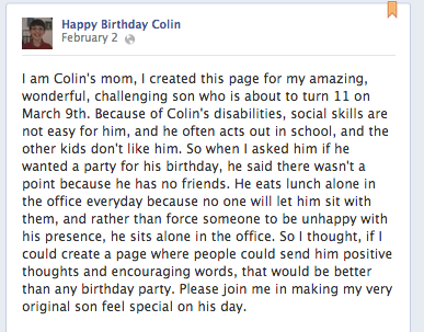 There is a little boy in Minnesota whose birthday is coming up, but who doesn’t have friends at school . . . his mom made this facebook page, and you could always take a moment to write him a birthday card tomorrow!